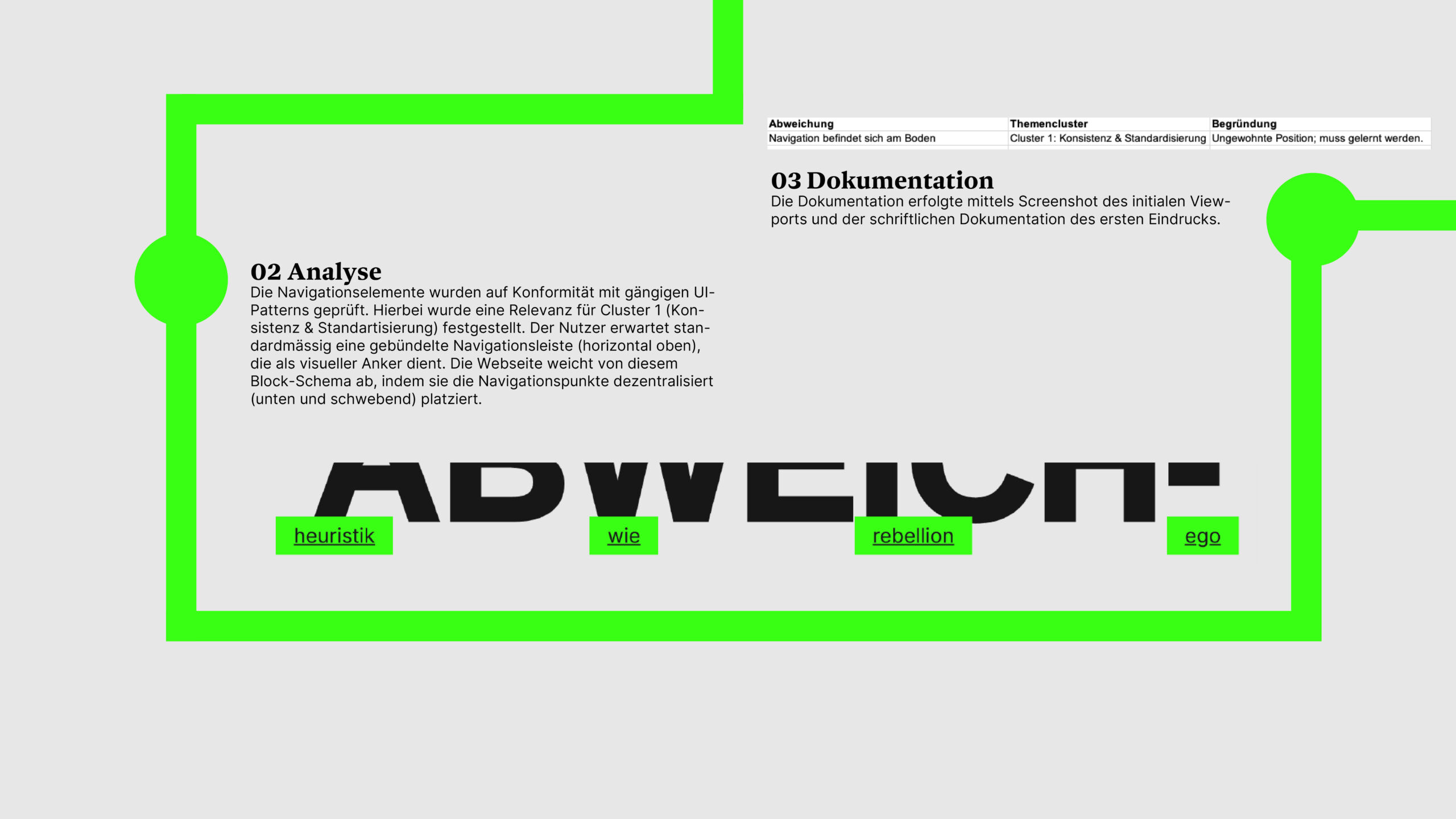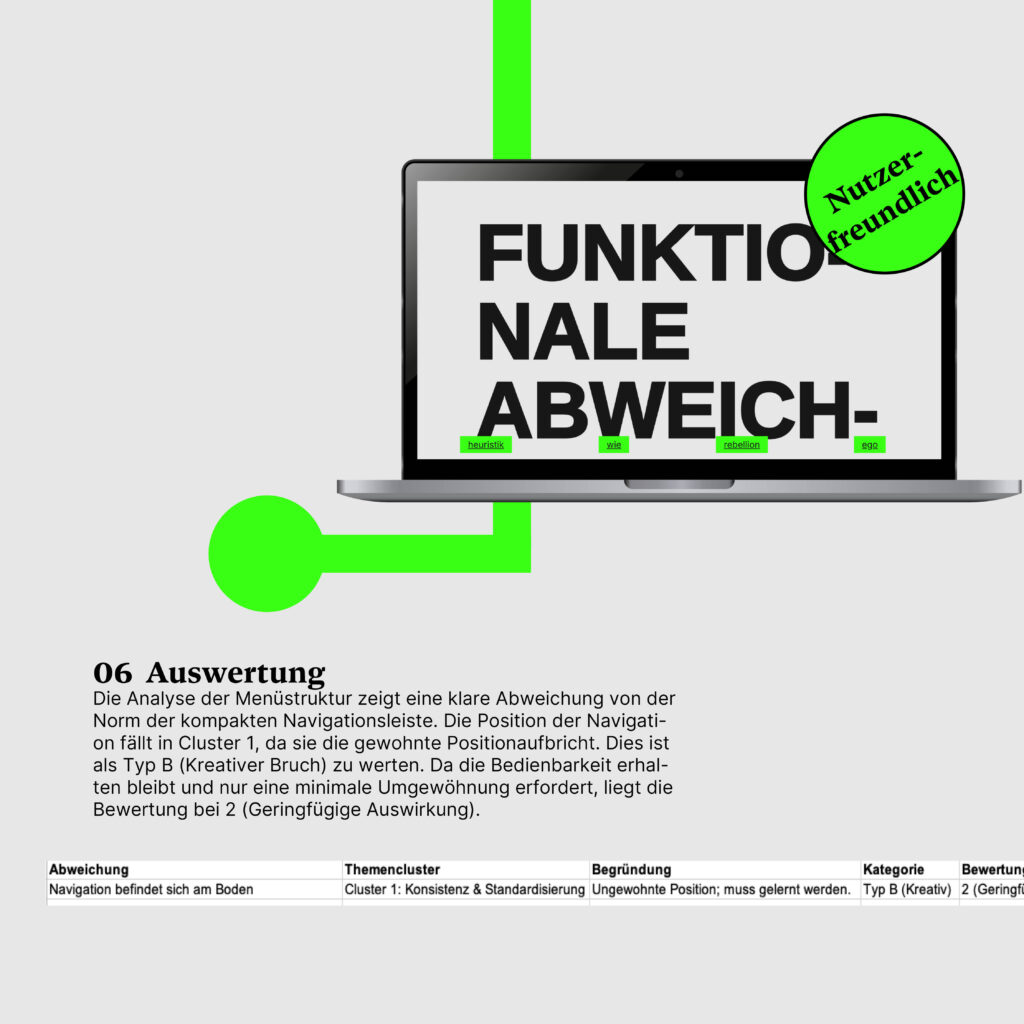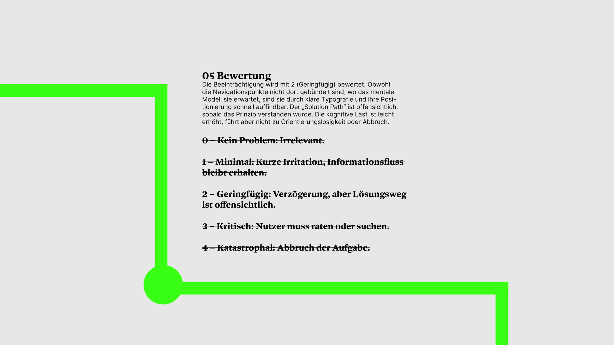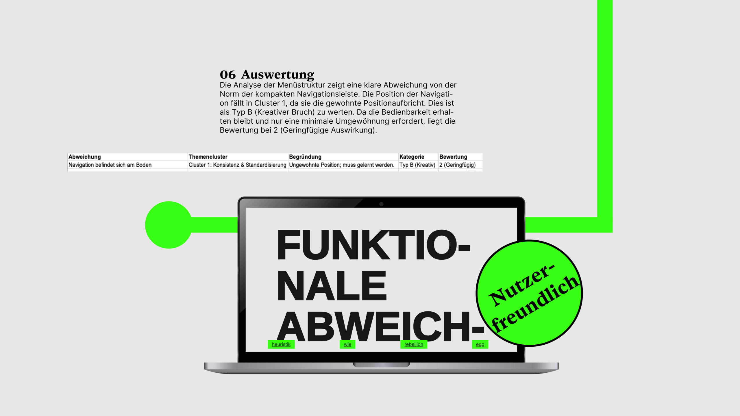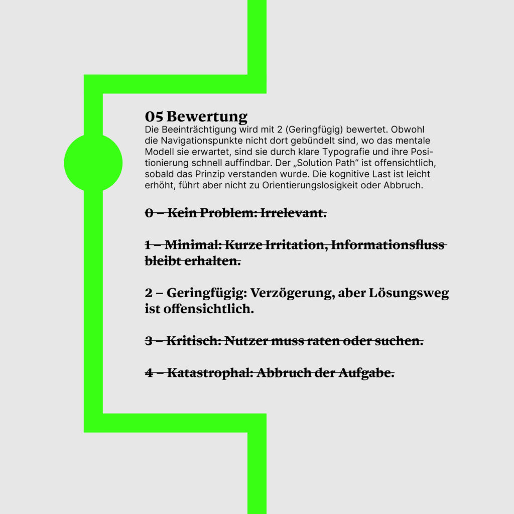 Begründung: Obgleich diese Gestaltung den klassischen theoretischen Anforderungen an Standardisierung und Konsistenz entgegensteht, zeigt die Analyse, dass die veränderte Positionierung für den Nutzer schnell erlernbar ist und die Usability nicht substanziell beeinträchtigt.