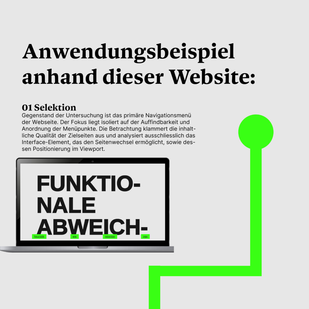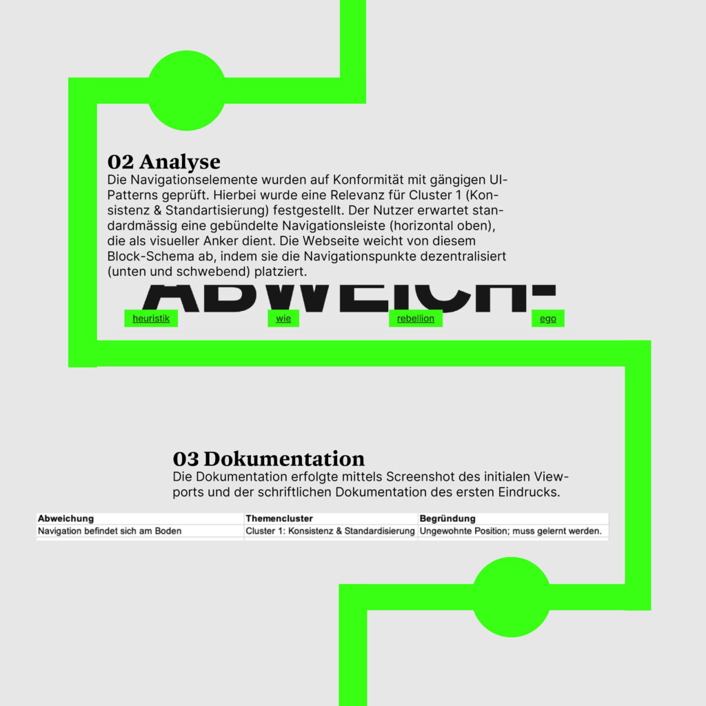 Die Bewertungsgrundlage bilden Nielsens Heuristik Nr. 4 („Konsistenz und Standards“) sowie Shneidermans erste Regel („Streben Sie nach Konsistenz“). Beide Ansätze fordern, dass Nutzer nicht rätseln sollten, ob verschiedene Wörter, Situationen oder Aktionen