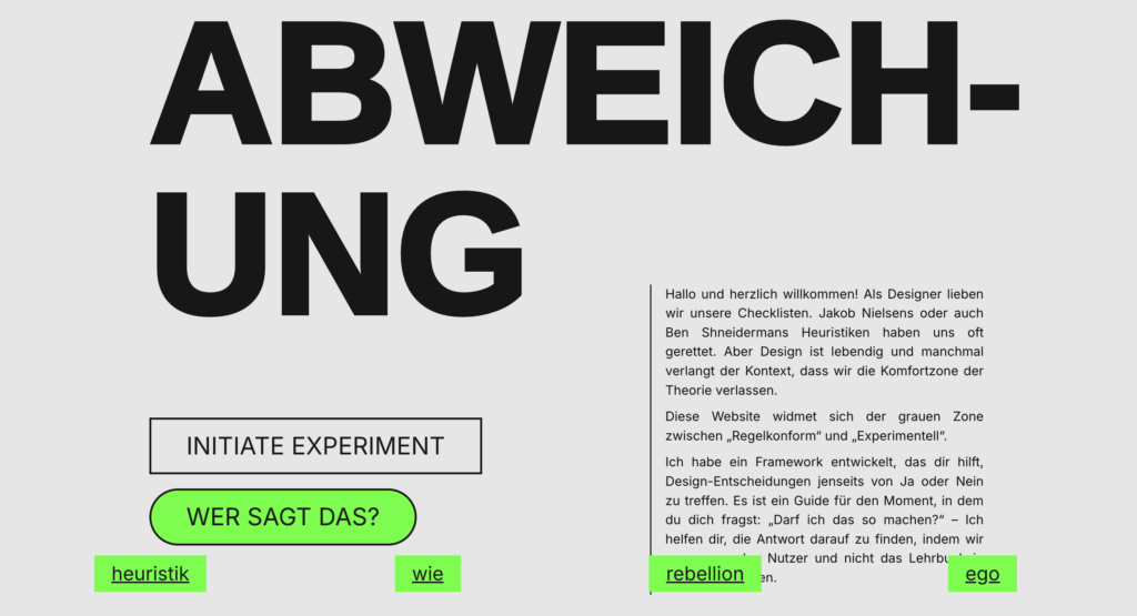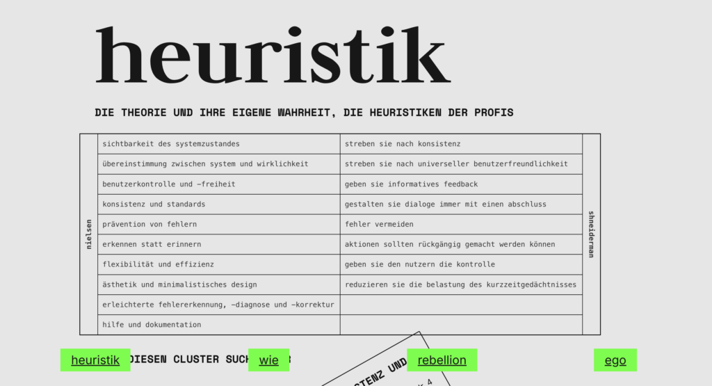 Hallo und herzlich willkommen! Als Designer lieben wir unsere Checklisten. Jakob Nielsens oder auch Ben Shneidermans Heuristiken haben uns oft gerettet. Aber Design ist lebendig und manchmal verlangt der Kontext, dass wir die Komfortzone der Theorie verlassen.